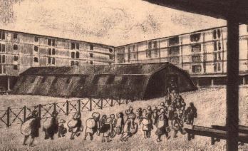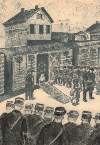 Les enfants de la rafle du Vel’d’Hiv’, en provenance des camps du Loiret, arrivent à la gare du Bourget-Drancy, le 15 août 1942. Les enfants se dirigent vers la baraque de la fouille, 15 août 1942. Estampes de Georges Horan, interné à Drancy, dans son ouvrage Drancy, suivi d'une photo d'enfants prise dans la cour de Drancy !